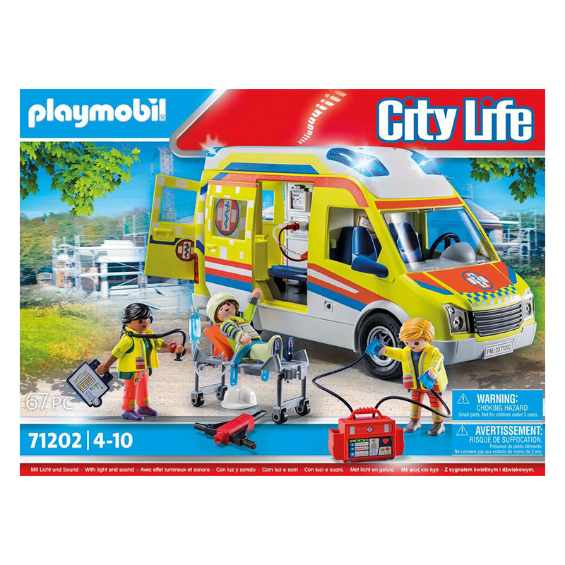 La Ambulancia con luz y sonido (71202) es el vehículo de respuesta rápida para la ciudad. Incluye una camilla, equipamiento médico, figuras de paramédicos y, lo más importante, luces intermitentes y sonidos de sirena para una experiencia de juego inmersiva.